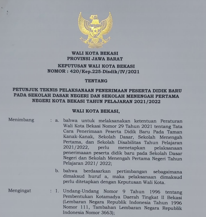 Kepwal dan Perwal Tentang PPDB SMP Kota Bekasi